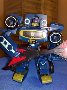 Soundwave is... wow, somehow it represents the classic Soundwave - the cassette/tape recorder thing. Laserbeak is also there as the guitar. The leg part initially is not easy to be transformed until I got a 'feel' of it.
